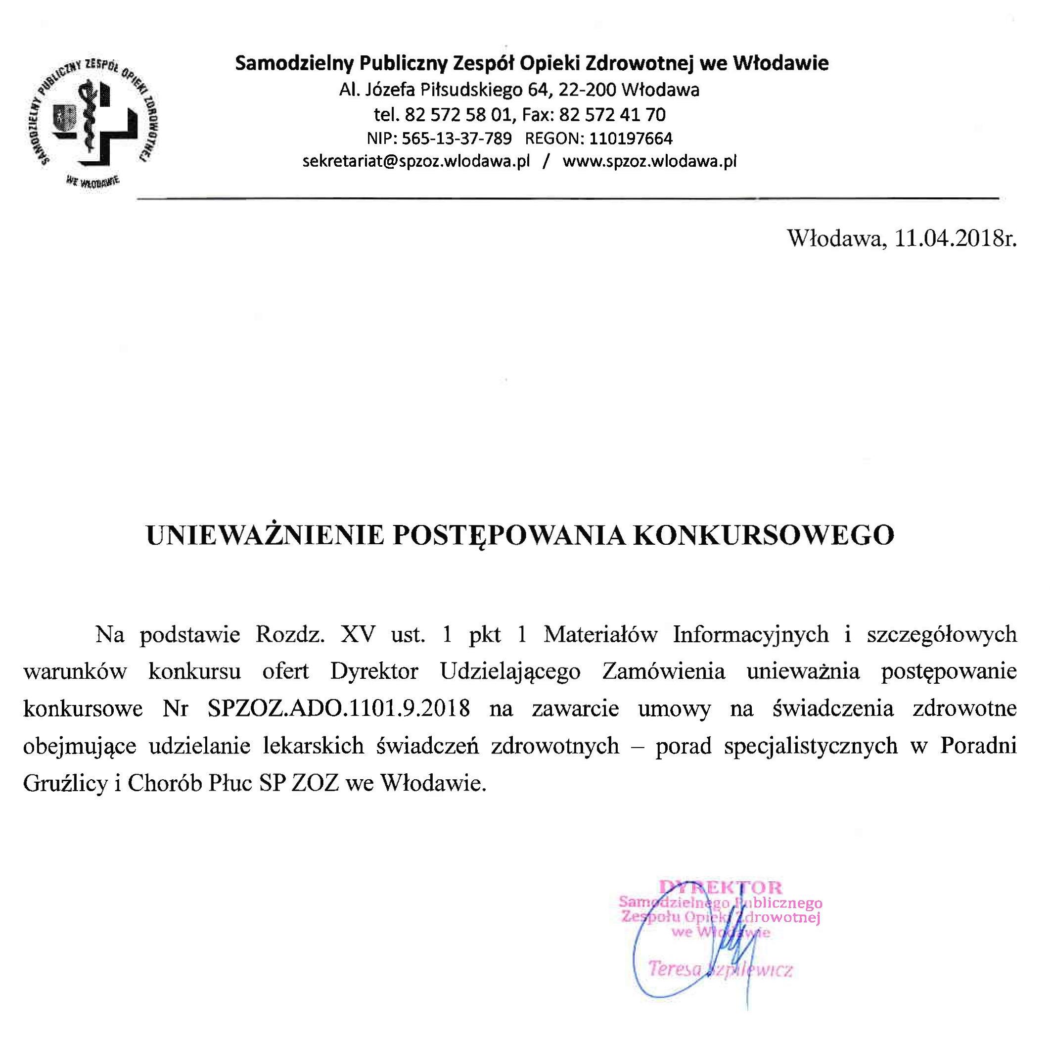 - Samodzielny Publiczny Zespół Opieki Zdrowotnej we Włodawie zastrzega sobie prawo do przesunięcia terminu składania ofert, odwołania konkursu bez podania przyczyny, a także przeprowadzenia dodatkowych negocjacji z oferentami.